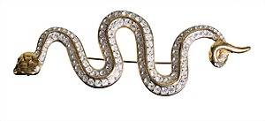 decorative brooch, "SCHLANGE", gold colored, unsigned, green glass eyes, clear rhinestones in two rows, lenght = 95.5 mm