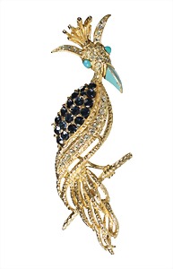 brooch, bird, gold colored, signed FLORENZA (USA), set with white and blue stones, enamel coating, height = 93.5 mm