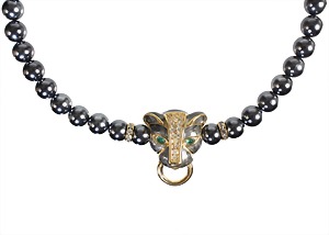 Collier, goldfarben, sig. K.J.L. for Avon (Kenneth J. Lane), anthrazitfarbene Perlen D = ca. 11,8 mm, zentral dekorativer Pantherkopf mit farblosem Strass besetzt, grüne Glasaugen, Schraubverschluss, L = 47,5 cm