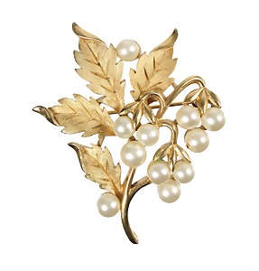 Brosche, "TRIFARI", Metall goldfarben, sig. TRIFARI, weiße Kunstperlen, ca. 44,0 x 52,0 mm