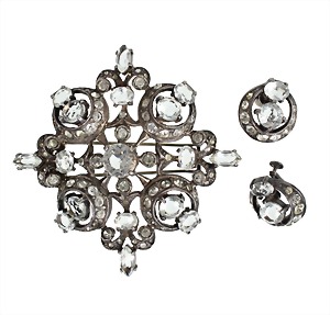 Lot: Brosche u. Ohrschmuck, "EISENBERG" 1940er Jahre, Silber STERLING (925/-), sig. Eisenberg, Brosche, farblose Strasssteine in quadratischer Anordnung, ca. 64,0 x 64,0 mm, Doppelnadel; dazu passend 1 Paar Ohrschrauben, halbmondförmig, D = 19,0 mm