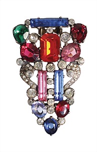 Brosche, Silber 925/000 (punziert: STERLING), unsig., farbenfrohe Glassteine in vorwiegend roten, rosé und blauen Farbtönen, dazwischen farbloser Strass, aufwändige Doppelnadel, ca. 67,5 x 41,5 mm, schwer gearbeitet