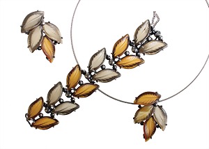 Lot: Modeschmuck mit gravierten Blättern in verschiedenen Brauntönen, "VINTAGE", USA Mitte 20.Jhd., weißes Metall, 1 Armband, signiert SCHIAPARELLI, Klappschließe mit Sicherheitskettchen, L = 18,5 cm; 1 Ring, Silber 925/000signiert, Ringkopf ca. 34,5 x 54,5 mm, RW ca. 54,5, Collier mit Anhänger, unsig., H = 55,5, Stahlseil mit Bajonett-Schließe, L = ca. 44,5 cm