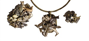 Lot: Collier, Armreif u. Ring, USA 1970/80er Jahre, Messing, alle sig. PAL KEPENYES, beweglich (drehbar) eingearbeitete Symbole, Reif (beweglich); Anhänger H = ca. 66,0 mm, Armreif innen: ca. 58,5 x 46,5 mm (zum Öffnen); Ring, RW ca. 52,5