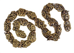 Gürtel, USA 1970/80er Jahre, Messing, sig. PAL KEPENYES, einzelne Elemente mit beweglich eingearbeitete Symbolen (drehbar), H = ca. 30,0 mm, L = ca. 89,0 cm