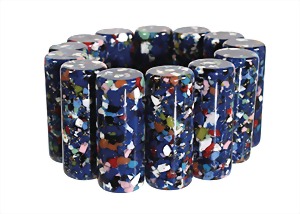 bracelet, "VINTAGE" (Italy ?), speckled colored plastic cylinders, diameter = 16.5 mm, width = 40.2 mm, on an elastic band (two-strand), inside: diameter = c. 52-53 mm