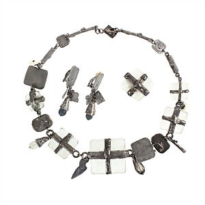 lot jewelry: silvery antique finish, faceted etched glass cross-shaped bordered, 1 ring, ring width c. 54, 1 necklace, hanging wing and drop, lenght = c. 48.5 cm, a pair of ear clips, height = 56.4 mm