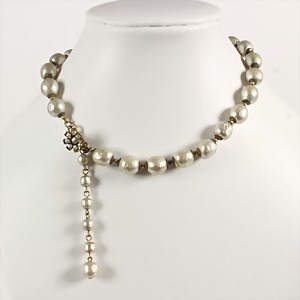 necklace, gold colored, signed K.J.L. for Avon (Kenneth J. Lane), anthracite-colored pearls with a diameter of c. 11.8 mm, in the center a decorative panther head set with colorless rhinestone , green glass eyes, screw lock, lenght = 47.5 cm