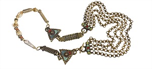 Dekorative "VINTAGE" Kette, goldfarben, sig. JPG, farbiger Emaillelack, 4-reihige Kette mit Knebelschließe, spiralförmiger Teil wohl nachträglich ! L = 109,0 cm
