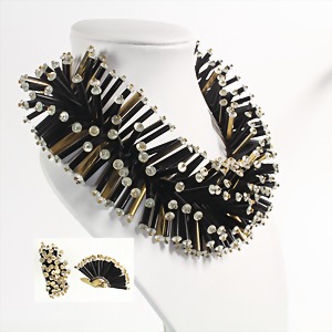 lot: 1 necklace "VINTAGE", black and golden little sticks with white glass stones at the ends, lenght = 37.5-42.0 cm, (chain= plaited ribbon), along with it suitable ear clips, 1 necklace, consist of balls made of black and transparent glass, lenght = 43.0 cm (a part of the clasp is missing !)