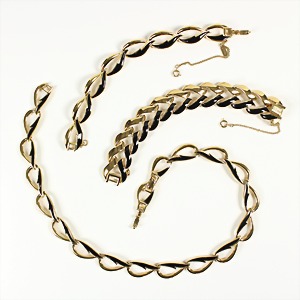 Lot: Modeschmuck, Metall golbfarben, 1 Armband, sig. Grosse GERMANY 1968, kordierte Kreise, L = 20,8 cm; 1 Kette, sig. Grosse GERMANY 1973,geriefte Kugeln, L = ca. 80,0 cm; 1 Armband, Schweiz sig. GB MM GENEVE, 20 Micron. Verg., L = 19,0 cm; 1 Brosche, SONNE, sig. HELENA RUBINSTEIN, D = ca. 45,0 mm; 1 Stik-Pin LIPPENSTIFT sig. LANCOMB, farbiger Emaillelack, h = 30,2 mm; 1 Lippen-Brosche (Mund & NASE) sig. Dali; 1 LIPPEN Armband, sig. SALVADOR DALI (Mund-Nase), Knebelschließe, L = 19,0 cm sehr guter Zustand ! Interessantes Lot !