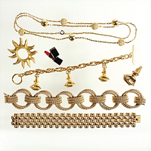 lot: fashion jewelry, metal golbfarbend, 1 bracelet, signed big Germany 1968, knurled circles, lenght = 20.8 cm, 1 necklace, signed Grosse GERMANY 1973,grooved balls, lenght = c. 80.0 cm, 1 bracelet, Switzerland signed GB MM GENEVE, 20 Micron. gilded, lenght = 19.0 cm, 1 brooch, sun, signed HELENA RUBINSTEIN, diameter = c. 45.0 mm, 1 stick pin lipstick signed LANCOMB, colored enamel coating, height = 30.2 mm, 1 lips brooch (mouth and nose) signed Dali, 1 lips bracelet, signed SALVADOR DALI (mouth-nose), toggle clasp, lenght = 19.0 cm very good condition ! interesting lot !