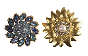 lot brooches: flowers, gold colored, signed SWAROWSKI, 1 brooch , colorless rhinestone, 1 art-bead, diameter = 31.6 mm, 1 brooch sunflower, light blue rhinestone, diameter = 26.5 mm