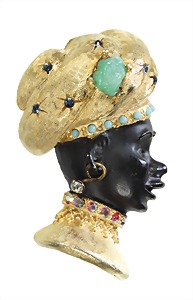 Brosche, "VINTAGE" 1959/60er Jahre, "MORETTI", goldfarben, sig. HAR (Hargo Creations, New York), ausdrucksstark modellierter Kopf, schwarzer Emailleack, im Turban, grüner Rohkristall, blauer u. türkisfarbener Steinbesatz, kl. Ohrring, funkelnder Kragen, H = 50,0 mm