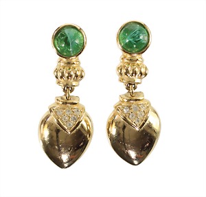 ear clips, "C. DIOR", metal gilded signed Chr. Dior GERMANY, green glass stone, hanging drop, with colorless rhinestones, lenght = 38.8 mm