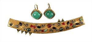 Lot "VINTAGE": 1 dekorative Nadel BOGEN, Messing verg., sig. MICHAEL GOLAN, Oberfläche mit verschiedenen Steinen u. Spiralen verziert, L = 11,9 cm; 1 Paar Ohrhänger, goldfarben, sig. MARC LUBERA, grün marmorierte Steine, H = 24,0 mm