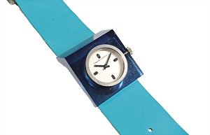 ladies watch, "VINTAGE" Paris 1970s, manual winding signed PIERRE GARDIN "JAEGER" MADE IN FRANCE, N° 907144 (Espace line), case: blue, transparent plastic c. 34.0 x 40.3 mm, screwed stainless steel bottom, strap (turquoise-colored) width = 29.0 mm, clock is running ! rare !