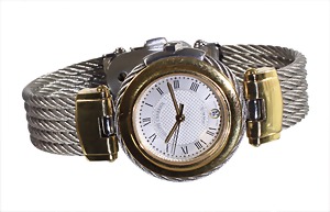 Damen-Armbanduhr, "PHILLIP CHARRIOL" Schweiz, Quarz, Edelstahl/Gold, röm. Zahlen, Zentralsek., Dat. auf 6 Uhr, D = 35,7 mm, Saphirglas, 5-reihiger Stahlreif, Spezialschließe mit drei Einstellungsstufen, innen: ca. 56,0 x 42,0 mm, guter Zustand ! Benötigt eine neue Batterie !
