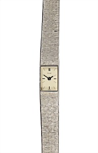 ladies watch, "PIAGET" from the 1967s, white gold 750/000 signed PIAGET, stick index, blued hand, a so-called Backwinder (setting of the hands and wind up mechanisme are at the bottom of the case), folding clasp, lenght = 16.0 cm (very short !), clock is running, total 38.1 g, nice classic item with original box and guarantee card !