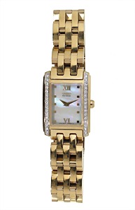 Damen-Armbanduhr, "CITIZEN" Eco-Drive, Stahl vergoldet, Perlmutt Ziffernblatt, röm. Zahlen u. Punkt Index, Gehäuse ca. 19,0 x 16,5 mm, seitlich mit zwei Reihen weißen Steinbesatz, Metallband mit Faltschließe, guter Zustand, Uhr läuft !