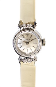 ladies watch, "TISSOT" Switzerland 1970s, white gold 750/000, manual winding, pessed bottom, diameter = 17.0 mm, at the side watch strip abutting always 2 brilliants, total c. 0.12 ct tw-vsi, watch strap made of patent leather with pin buckle, 1 black spare leather watchstrap !