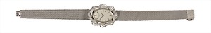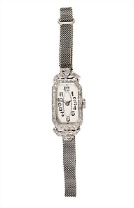 fine ladies watch, ART-DECO from the 1920s, platinum case, cream-colored clockface with Arabic index, blued hand, 40 pieces 8/8 diamonds white, case is at the side elaborate engraved, ribbon, white gold 9 ct, bracelet is stepless adjustable by a special folding mechanism , clock is running !