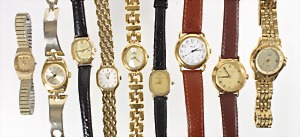 Lot: 9 Damen-Armbanduhren, 1 M & M; 1 Maurice Lacroix; 1 Citizen; 1 RAYOTIME, alle mit Lederband u. Dornschließe; 1 Citizen "Eco-Drive"; 1 Christ mit Perlmuttziffernblatt; 1 Tissot u. a. mit Metallbändern, ungeprüft !