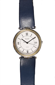 ladies watch, "VAN CLEEF & ARPELS" Paris around 1990, "La collection", quartz, steel/gold, white clockface, centre second, date at 6 'o clock, pressed bottom, diameter = 33.5 mm, Ref. 47 103 40845, leather watchstrap with pin buckle, clock is running ! (needs a new battery) !