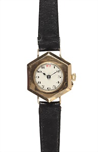 Damen-Armbanduhr, "ART-DECO" 1920/30er Jahre, GG 585/000, arab. Zahlen, die Zahl 12 ist rot abgesetzt, D = ca. 26,6 mm, Lederband mit Dornschließe, Uhr läuft ! Schönes, zeitgemäßes Design, (umgebaute Taschenuhr)
