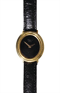 ladies watch "CHOPARD", Switzerland 1978, manual winding, yellow gold 750/000, black clockface, case 21.8 x 24.5 mm, signed L.U.CHOPARD & CIE GENEVE, N° 84839, 5045 1, Kal. ETA RZ 2412, watchstrap made of ostrich leather with pin buckle, clock is running !