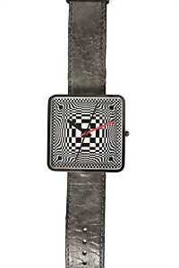 Künstler-Uhr, "VICTOR VASARELY", "INTERLOOK"; quadratisches Gehäuse ca. 40,2 x 40,2 mm, Glasboden, Quarz, Cal.: ETA 955 414, graues Lederarmband mit Dornschließe (Made in Austria)