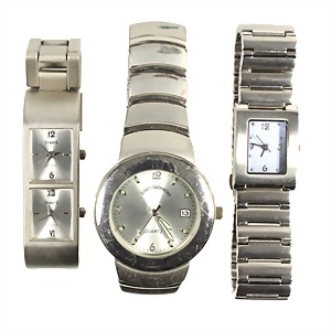 Lot Uhren, "VINTAGE", 1 "Louis Valentino", Zentralsek., Dat. Auf 3 Uhr; 1 "VIA MODA", beide mit Metallband und Faltschließe; 1 Uhr für 2 Zeitzonen ! 1 Metallband, ungeprüft !