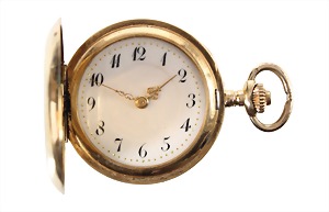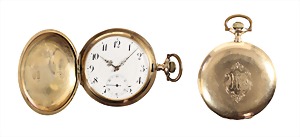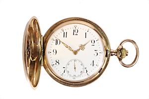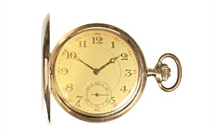 Herren-Taschenuhr, Schweiz um 1900/10, GG 585/000, gut erhaltenes weißes Emaille-Zifferblatt, feine goldene Zeiger, arab. Std. u. Minuten, kl. Sekunde auf 6 Uhr, Ankerhemmung, Breguet-Spirale, Staubdeckel Metall, beidseitig fein graviert, vorne mit dezentem Monogramm, D = 50,7 mm, Gehäuse berieben, total 92,2 g, Uhr läuft !