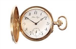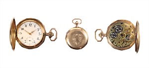 Herren-Taschenuhr, Schweiz um 1890/1900, GG 585/000, sig., sehr gut erhaltenes weißes Emaille-Zifferblatt, sehr feine gebläute Zeiger, arab. Zahlen, kl. Sekunde auf 6 Uhr, Ankerhemmung, Breguet-Spirale, Zeigerstellung seitlich neben Krone, Staubdeckel Gold, beidseitig fein graviert, D = 35,0 mm, guter Zustand, total 41,5 g, Uhr läuft !