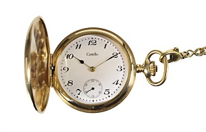 Herren-Taschenuhr, Schweiz um 1900/20, GG 585/000, sig.: Castello, sehr gut erhaltenes weißes Emaille-Zifferblatt, feine goldene Zeiger mit schwarz emaillierten Spitzen, arab. Zahlen, kl. Sekunde auf 6 Uhr, Ankerhemmung, Breguet-Spirale, Staubdeckel Metall, beidseitig fein graviert,, D = 46,4 mm, total 85,3 g, Uhr läuft !