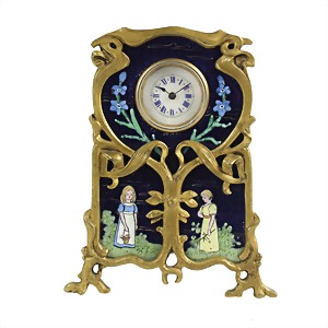 Kleine Tischuhr/Standuhr, JUGENDSTIL um 1900, weißes, gut erhaltenes Emaille-Ziffernblatt, gebl. Zeiger, röm. Index, goldene Punkte, Zylinderwerk, (Werk muß überholt werden !). Blau emaillierter Hintergrund mit stilisierten Vergissmeinnicht, Mutter u. Tochter im Grünen, umgeben von rankenden Ästen, Oberfläche fein strukturiert, schöner Jugendstil !