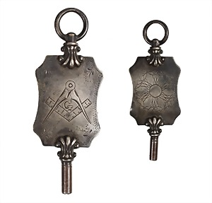 Taschenuhrenschlüssel, FREIMAURER 2.Hälfte 19.Jhd., Silber/Eisen, Freimaurersymbole: Zirkel u. Winkel, in der Mitte ein G, umlaufend, zart graviertes Ornament, Aufhängung drehbar, L = 54,6