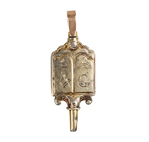 Taschenuhrenschlüssel, FREIMAURER 2.Hälfte 19.Jhd., feuervergoldet, "BUCH DER WEISHEIT", Freimaurersymbole: Zirkel u. Winkel, rechts ein G, aufwändig graviert, Aufhängung in Gold (drehbar), L = 48,7 mm