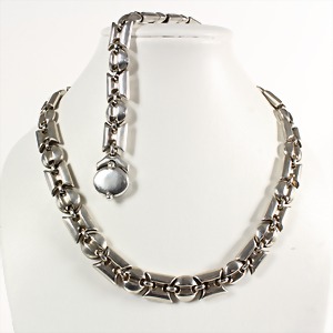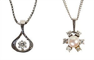 Dekoratives Collier, WG 585/000, mit abnehmbarerm Anhänger, Südsee-Perle 30,24 ct, 3 Brillanten ca. 0,15 ct tw-if (lupenrein), 7 Diamanten im Marquise-Schliff ca. 1,33 ct tw-if (lupenrein), H = 29,6 mm; Collier, S-förmige Drahtbögen, in den Gelenken sind 25 Brillanten ca. 1,76 ct tw-if (lupenrein) eingearbeitet, kl. Kastenschloss mit Sicherungsacht, L = ca. 38,0 cm; 1 Venezia-Kette, L = 48,0 cm (Zwischenöse bei 42,0 cm), (anbei 2 S-förmige Reserveglieder) total 28,4 g, mit Quittung ! Ein Collier für den besonderen Abend !