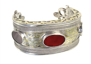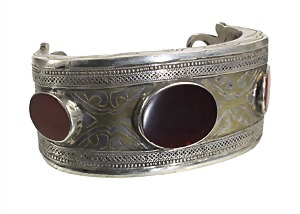 bracelet/bangle the Turkmens, Afghanistan first half of the 20th century, silver, partly gilded, surface ornament, 3 cornelian plates, width = 33.5 mm, total 84.4 g