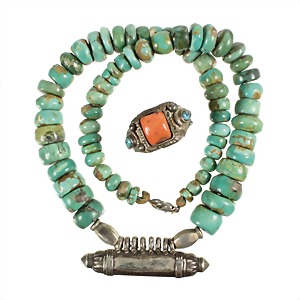 lot: antique jewelry, India/Nepal first half of the 20th century, 1 turquoise chain diameter = 6.3 - 13.6 mm, lenght = 42.5 cm, with prayer box in front , 1 ring, silver, coral and 2 turquoise, ring width c. 62/63, For this item a shipping to non-EU countries is not possible !