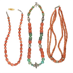 lot antique jewelry: India and Nepal first half of the 20th century, 3 coral necklaces: 1 necklace (threefold), lenght = 39.0 cm (clasp is new !), 1 necklace with turquoises (turquoise balls), silver elements, tonneau-shaped corals diameter = 9.0 - 10.5 mm, lenght = 43.5 cm, 1 necklace with twist-lock and silver colored eyes, lenght = c. 38.5 cm, all total 143 g, For this item a shipping to non-EU countries is not possible !