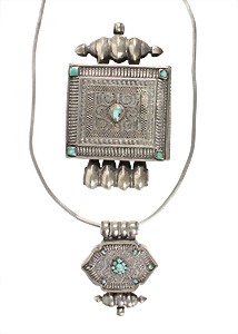 Lot: Antiker Silberschmuck, Indien/Nepal, Silber, 1 Tibetisch-buddhistischer Ritual Anhänger, besetzt mit 5 Türkisen, feine Drahtbelötung, Korpus zum Öffnen (ca. 80,2 x 72,8 mm, Dicke = 31,5 mm); 1 Anhänger mit Kette, Anhänger besetzt mit 15 Türkisen, feine Drahtbelötung, H = 80,8 mm, Kette L = 77,0 cm, alles total 310 g