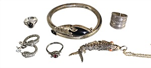 lot: silver jewelry Asia, 1 bracelet snake set with stones, diameter = c. 63.0 mm (inside measurement), 3 rings, 1 pair 3/4 hoop earrings and 1 pendant, fish (moveable made of) with corals eyes, height = 70.0 mm, chain lenght = c. 62.0 cm, For this item a shipping to non-EU countries is not possible !