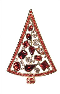 big brooch christmas tree, gold colored, not signed, red and clear rhinestones, height = 71.4 mm