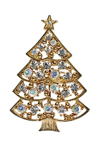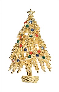 Brosche WEIHNACHTSBAUM, goldfarbene, sig. ART (USA), plastische geformten Tannenzweige, kleine farbige Strasssteine, H = 57,2 mm