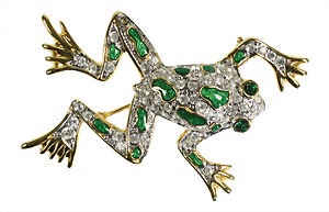 brooch frog, gold colored, not signed, decorated with clear rhinestones and green translucid enamel, c. 35.8 x 77.2 mm