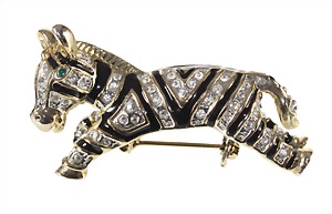 brooch shaped like a zebra, gold colored, not signed, clear studded with rhinestones and black enamel, green glass eyes, plastic formed, lenght = 52.0 mm, worn as shoulder brooch