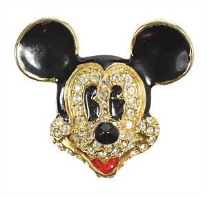 brooch, Mickey Mouse, gold colored, not signed, black and red enamel, colorless studded with rhinestones, brooch: c. 42.0 x 38.5 mm