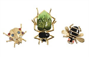 lot of three gold colored brooches: 1 ladybug (unsigned) jeweled with colored, round gems, 1 stag beetle (unsigned) with black-green enamel layer, c. 56.5 x 39.4 mm, 1 bee by D´Orleans (Paris) with black enamel and red eyes